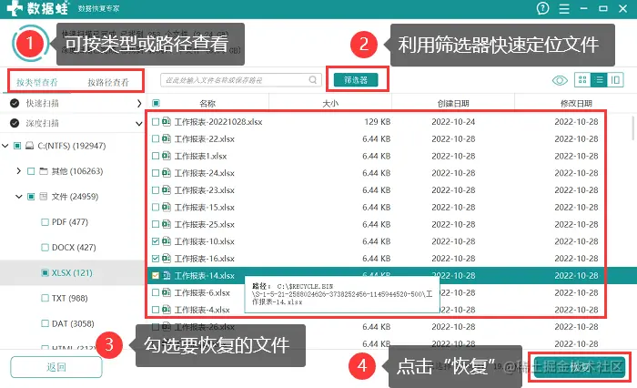 - 扫描需要一些时间,结束后可以按照个人需要对需要恢复的文件类型进行选择,并在右侧定位相关文件,选择完毕后,点击 【恢复】;