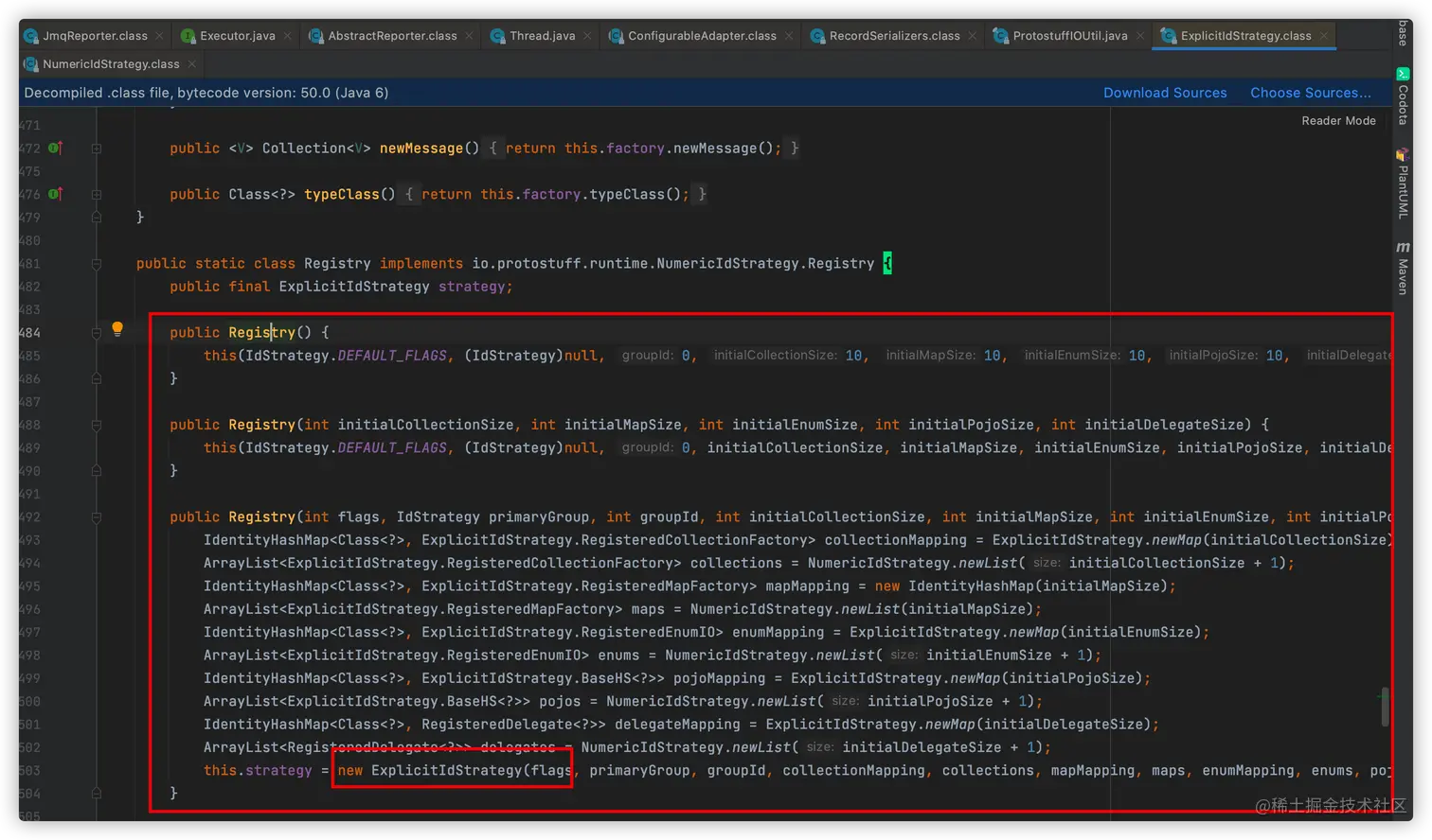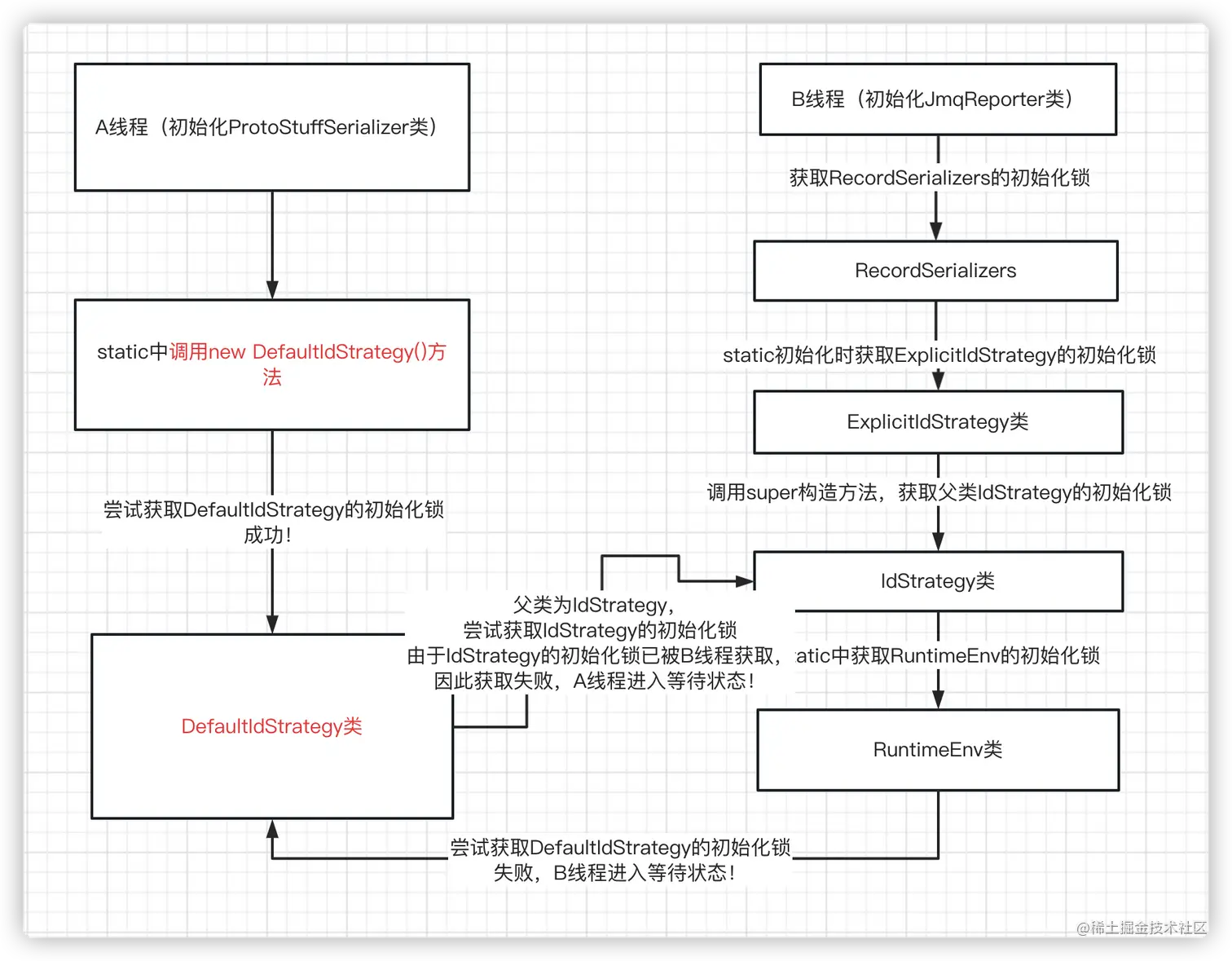 首次应该怀疑是类加载的问题,因为除了两百个线程停留在加载protostuffprotostuff(初始化有new DefaultIdStrategy()的代码)这个类上,此线程也处于等待状态,并且也在加载DefaultIdStrategy()的类上。