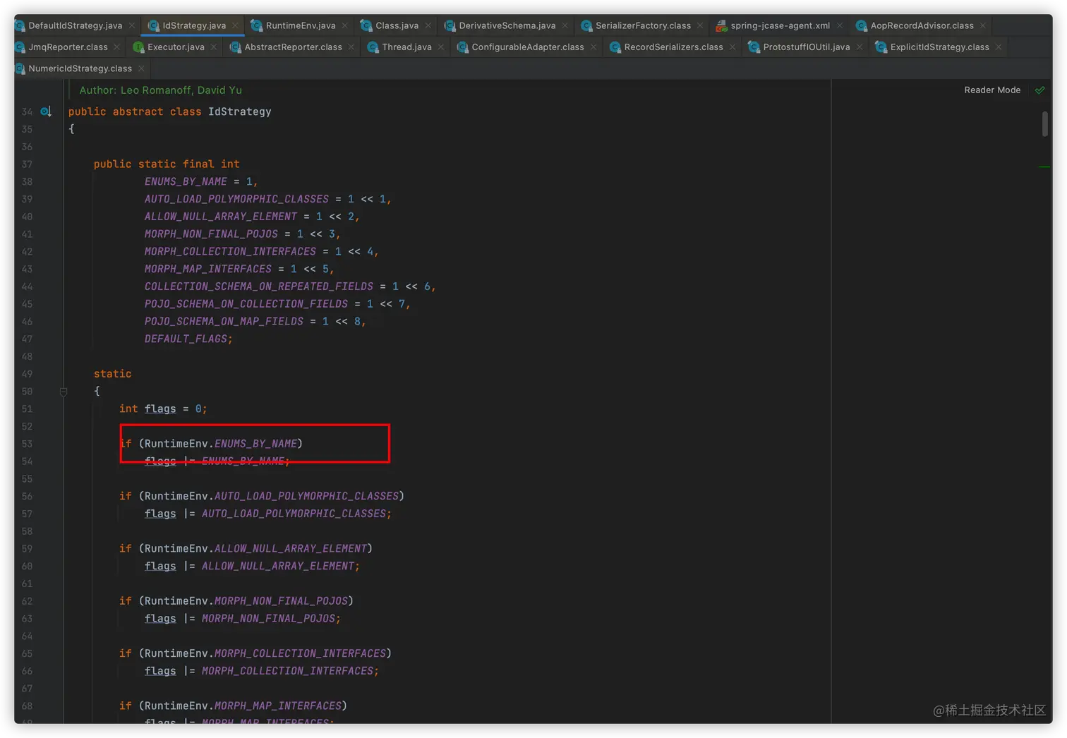 根据此线程的堆栈信息逐行排查代码,发现该线程执行JmqReporter.run方法时,会初始化RecordSerializers类;并在RecordSerializers中的静态代码块会执行如下代码: