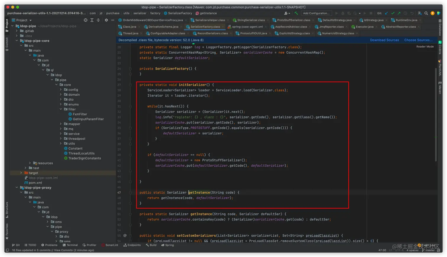 根据堆栈信息排查代码,发现代码会初始化一个自定义的序列化工厂类:SerializerFactory