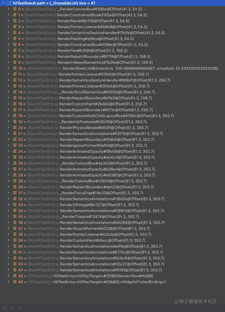 遍历顺序是从最底层子节点开始往上走,从最后的HitTestEntry可以看到分别是RenderView和GestureBinding两个类处理事件分发。