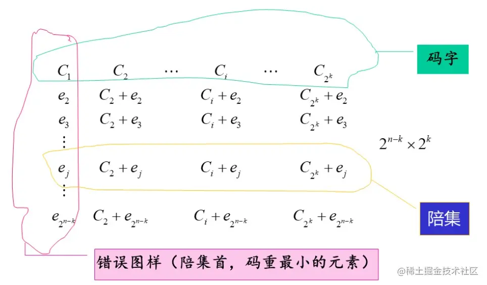 标准阵包含了 2n 个所有的可能接收矢量. 其第一行以全 0 码 字开始,包括了所有码字, 而第一列包括了所有可纠正的错误图样 (一般选汉明重量最小的元素)。每行称为一个陪集 (coset), 由第一列的错误图样 (称为陪集首)及其干扰的码字组成。 (n.k) 码的标准阵如下: