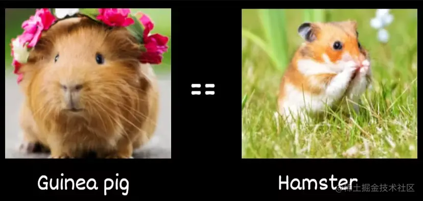 在严格的相等比较中,豚鼠和仓鼠不相等 === 比较两个值以获得相等。在比较之前,这两个值都不会隐式转换(强制)为其他值。
