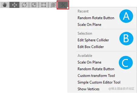要激活自定义 Editor 工具,请右键单击 Scene 视图工具栏中的 Available Custom Editor Tools 按钮。