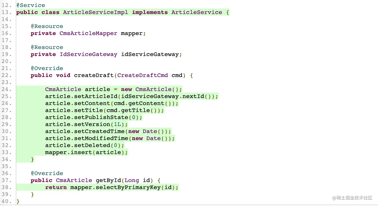 我们将Factory实现在Application层,ArticleDomainFactoryImpl的测试用例 和Service层的测试用例是非常相似的。测试代码如下: