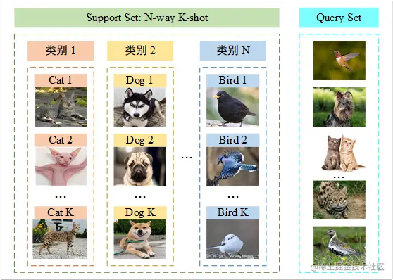 在元学习中,之前学习的任务称为元训练任务 (meta-train task), 遇到的新任务称为元测试任务 (meta-test task)。 每个任务都有自己的训练集和测试集, 内部的训练集和测试集一般称为支持集 (Support Set) 和查询集 (Query Set)。 支持集又是一个 N-Way K-Shot 问题,即有 N 个类别,每个类有 K 个样例。