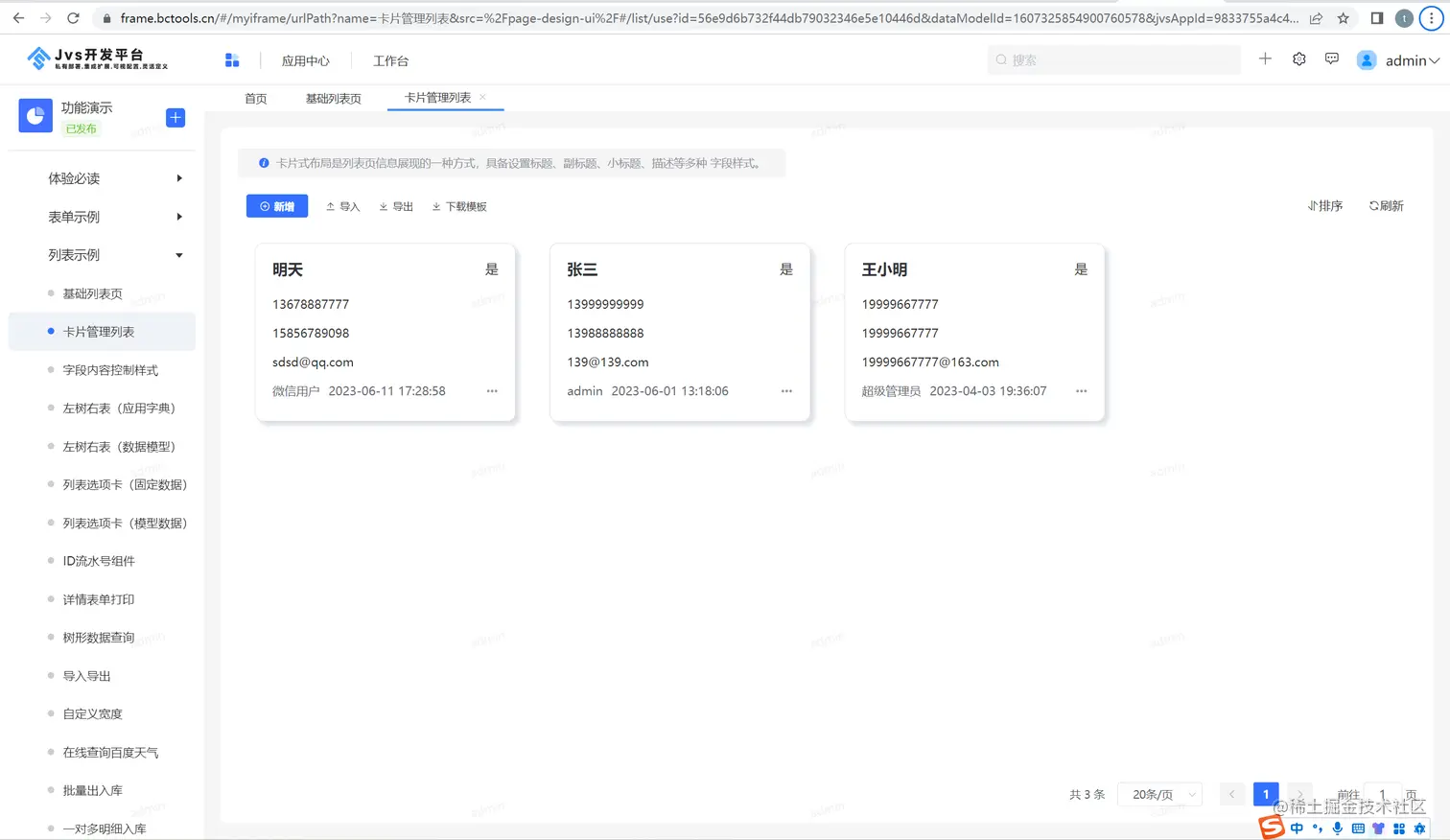 1、列表页支持多种列表展现,普通模式、卡片模式、树表模式