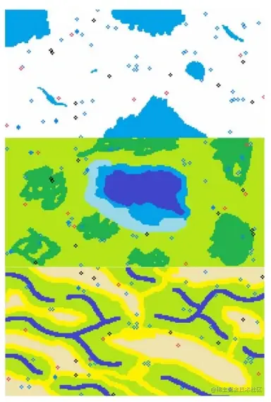 - 蓝色区域是水域。玩家不允许进入水中,因为他们不会游泳。另一方面,怪物可以在水中移动。