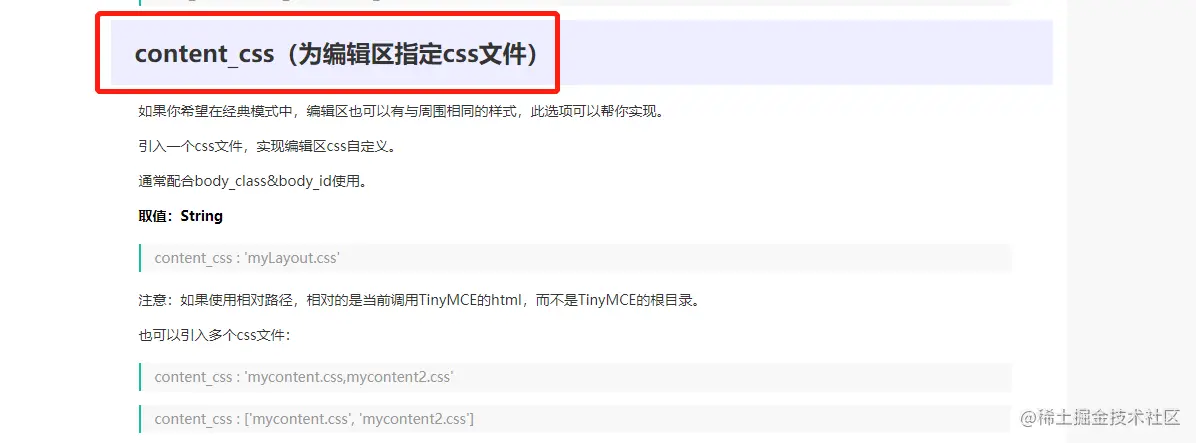 当时想着优化的时候就去再找了tinymce的文档学习查看,看看有没有什么比较好的解决方式。中文文档在这里,仔细看了一下发现了一个配置,content_css