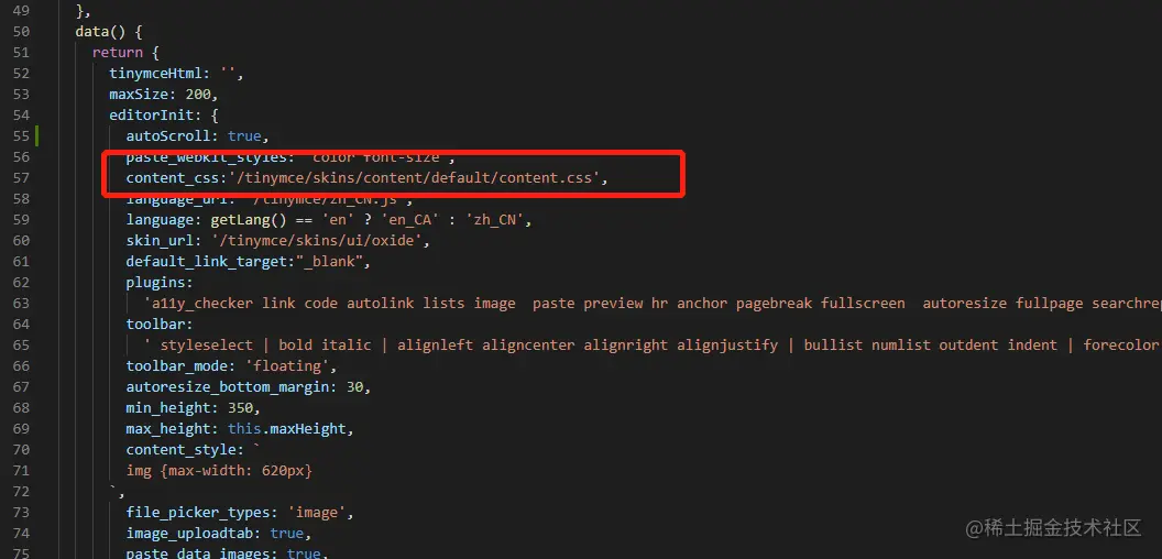 然后去tinymce组件的初始化中在配置类这里添加上定义的css文件就可以了。