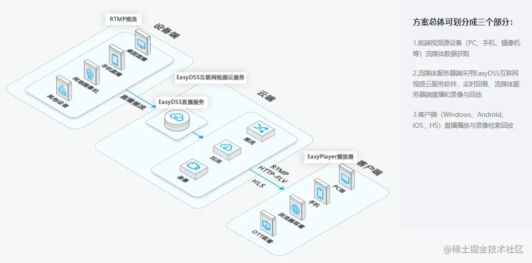 同时,该阶段互联网直播点播的需求也与日俱增,EasyDSS互联网直播/点播平台满足了学校、文旅等在线直播和点播需求,RTMP推流直播、视频文件点播,是一套流媒体点播、转码、管理、直播、录像、检索、实时回看于一体的一套完整的商用流媒体服务器软件解决方案。