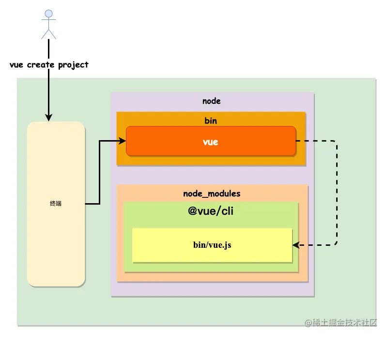 先把@vue/cli下载到/usr/local/lib/node_modules中,然后根据@vue/cli下的package.json,根据bin中定义去/usr/local/bin/下去定义@vue/cli的软链接vue