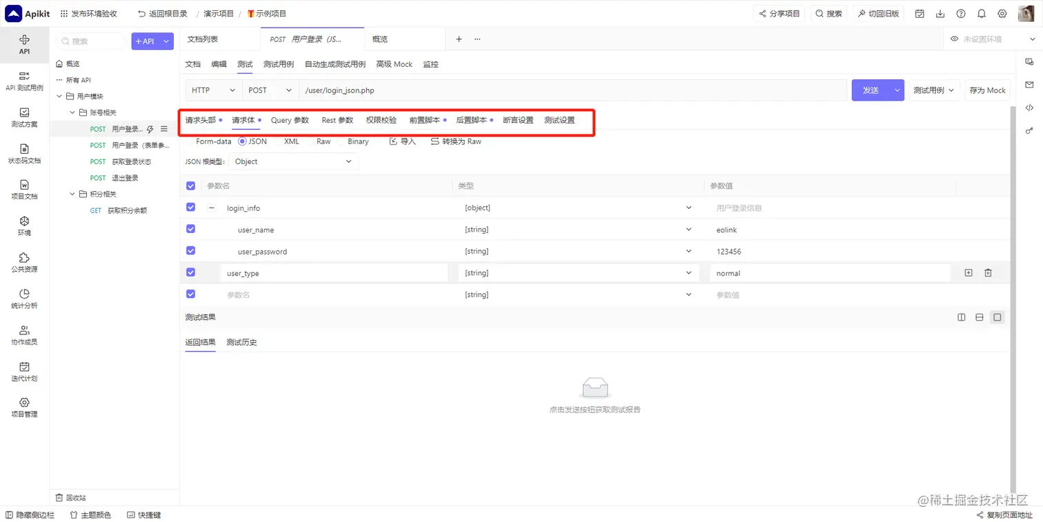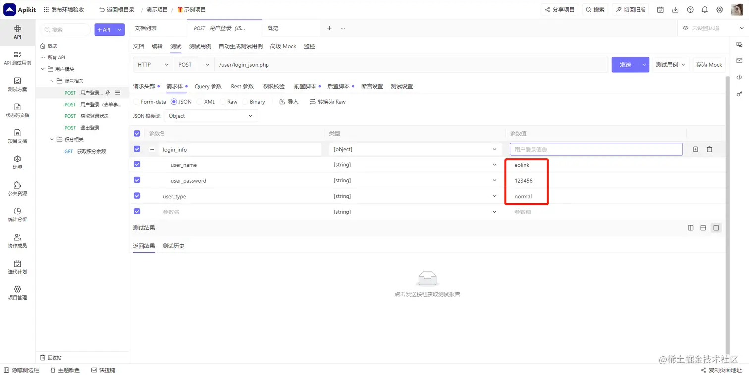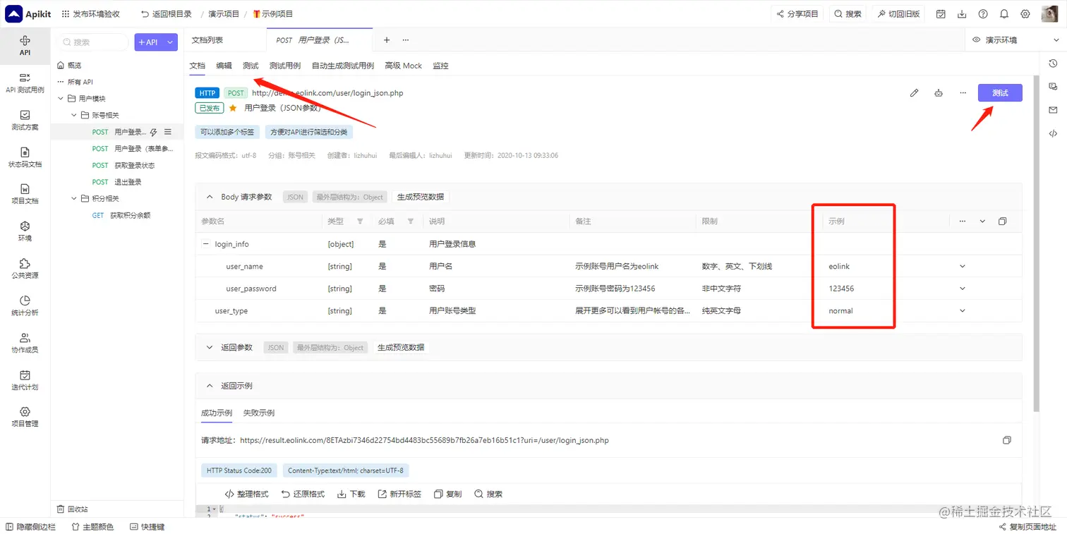 进入 API 文档详情页,点击上方 测试 标签,进入 API 测试页,系统会根据API文档自动生成测试界面并且填充测试数据。