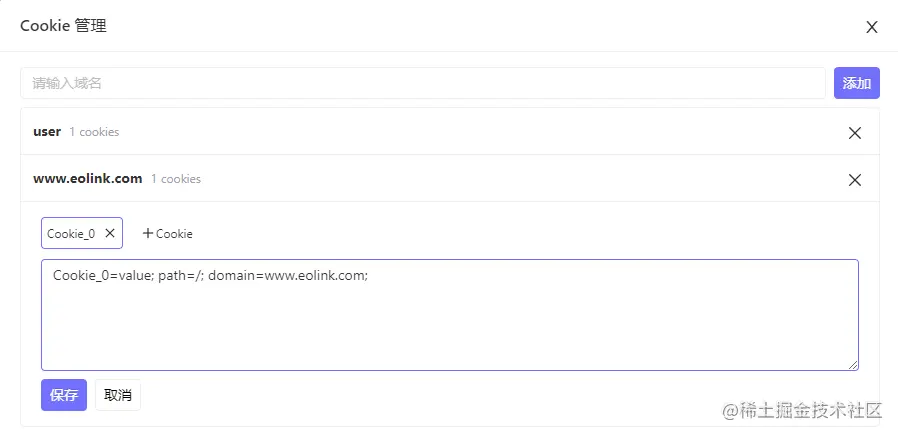 当您测试需要 Cookie 的 API 时,可以先进行一次 API 登录或者在 Cookie 管理里添加所需的 Cookie 信息,系统会自动将 Cookie 储存起来,下次测试其他相同域名的 API 时会自动传递 Cookie 请求参数。