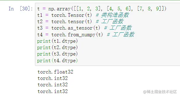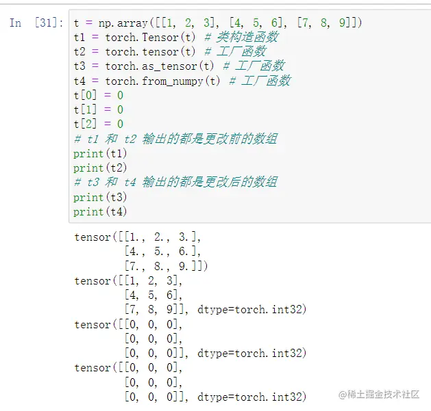 - 注1:在内存上区别,前两个方法是使用拷贝将数组中元素拷贝到张量中的,后两种是共享数据的,显然共享数据是可以节省空间的更加高效的(或者说这俩就是一种是深拷贝,一种是浅拷贝)
