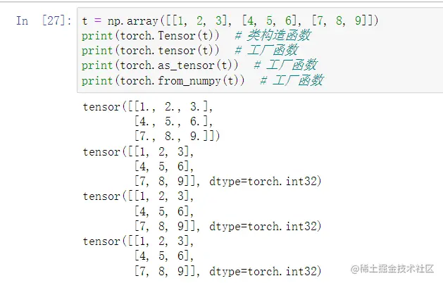 其中torch.Tensor()是类构造函数,其余三种为工厂函数。工厂函数是指接受参数输入并返回特定类型对象的函数,其允许更多的动态对象创建,有更多的配置参数。通常情况下更倾向于选择工厂函数