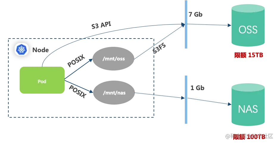 这个方案存在一个较大的问题,即直接使用裸露的对象存储性能非常差。另外,裸露使用对象存储的 S3FS 挂载点经常会出现莫名其妙的丢失。一旦挂载点丢失,容器将无法访问,如果要恢复挂载点,必须对整个容器进行重启,这对用户业务造成了很大的干扰。
