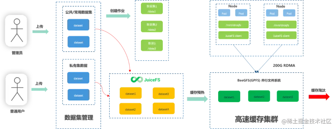 在使用 JuiceFS 时,我们还实现了一个数据编排功能。管理员可以将常用的数据集上传到文件系统某个目录,这个目录可以在上层抽象成一个公开的数据集。不同用户在创建作业时都可以挂载这些数据集。普通用户也可以上传自己的私有数据集,并通过 JuiceFS 的预热功能对这些数据集进行预热。