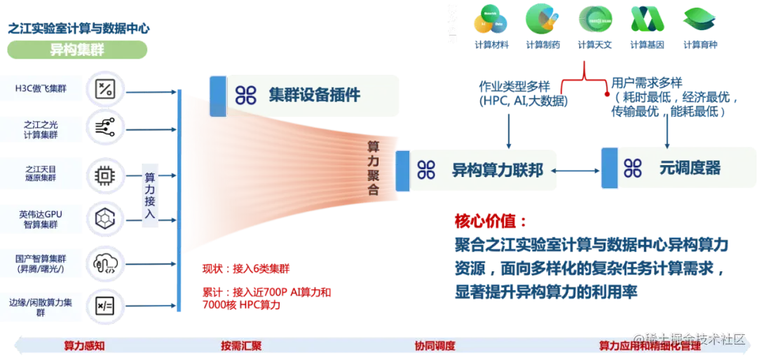 其次,我们实现了一个异构资源聚合方案。在之江实验室,我们拥有多个异构集群,包括CPU集群、GPU集群以及一些超算资源。这些不同类型的计算资源具有不同的使用方式。通过异构资源聚合方案,我们将这些不同的计算资源统一聚合,实现统一的管理和使用。