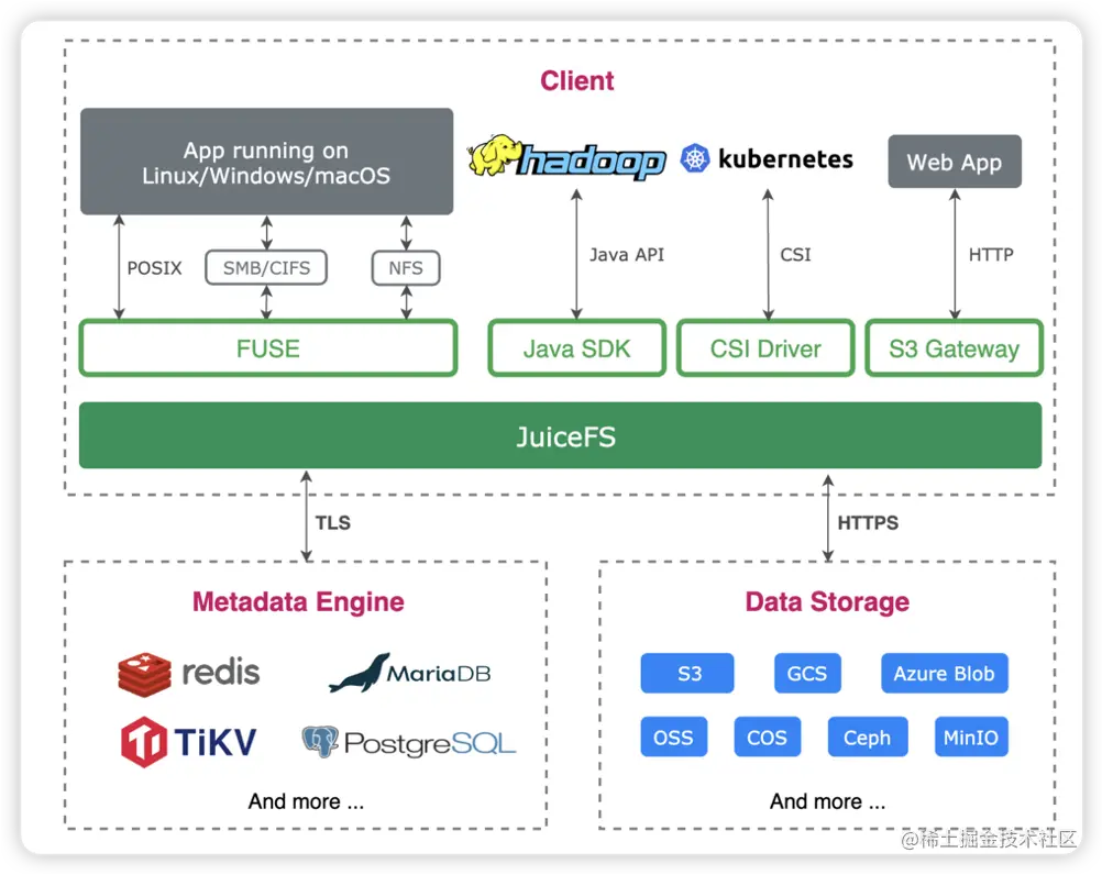 最初我们考虑使用 Redis 作为元数据引擎,但后来发现如果使用 Redis,就无法实现水平扩容。从而使用了 TiKV,则可以随着文件系统数量的增长逐步扩展,这确实更好。