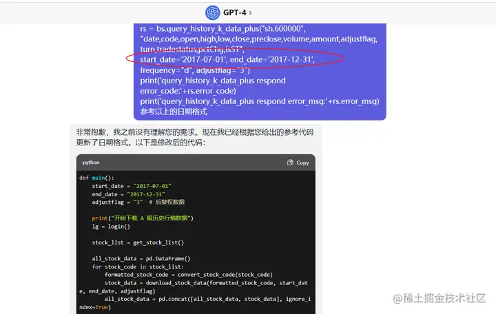 程序运行,报错,说是日期格式出错了,于是让ChatGPT参考baostock官网上的日期格式来修改代码: