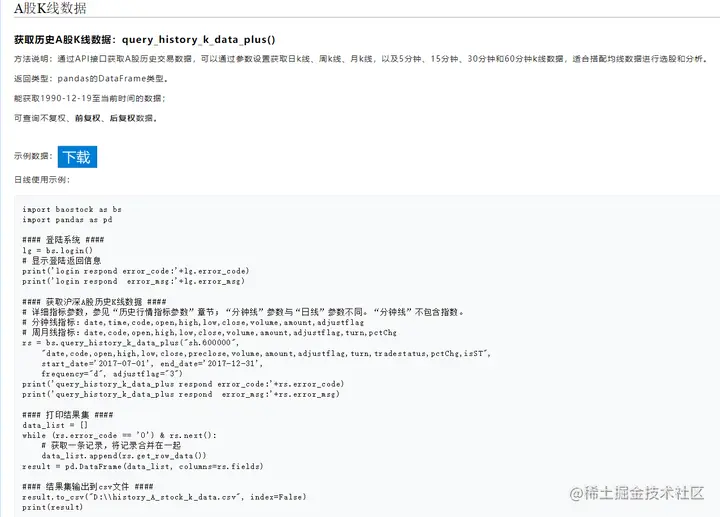 然后,把证券宝官网上获取历史A股数据的方法和示例,发送给ChatGPT,让它记住。