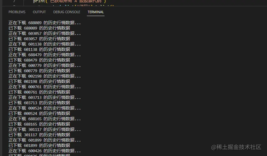 但是,数据没爬取几分钟,就停下来了。因为akshare的股票历史行情数据来自于爬取东方财富网站,因此猜测是东方财富网的反爬虫策略,不让一个IP地址的电脑长时间爬取数据。