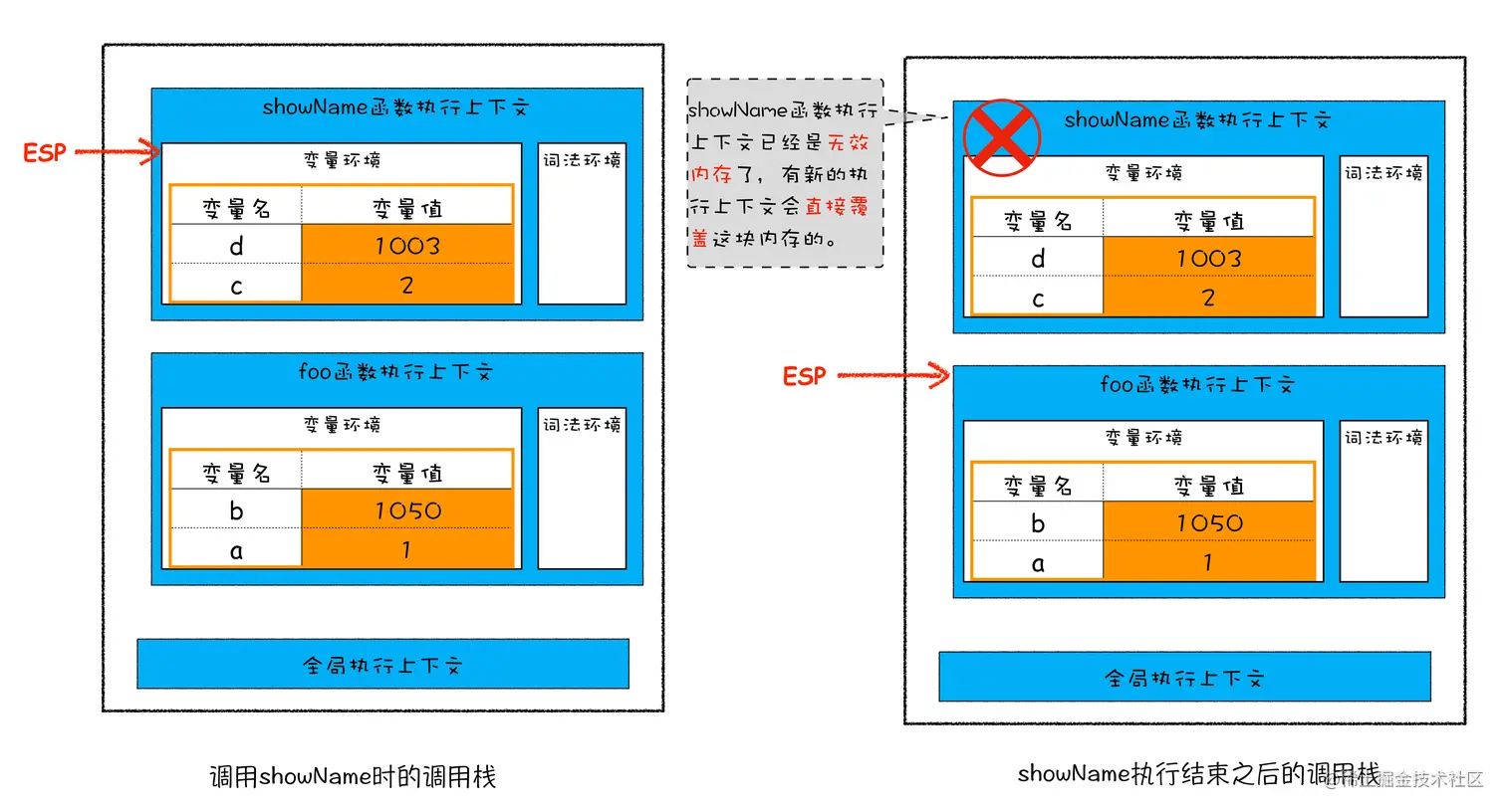 当该执行上下文运行完毕,ESP 下移,这个下移的操作就是销毁被执行过的上下文的过程。