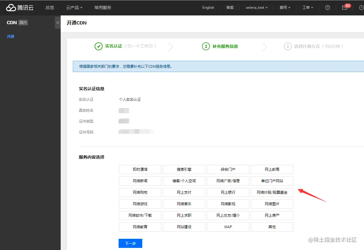在使用 CDN 服务前,您需要进行实名认证及 CDN 服务的开通,新用户登录 CDN 控制台 可以看到实名认证指引,单击前往认证可进行实名认证。完成实名认证后,进入 CDN 控制台,确认您的实名认证信息及选择服务内容,完成后单击下一步。