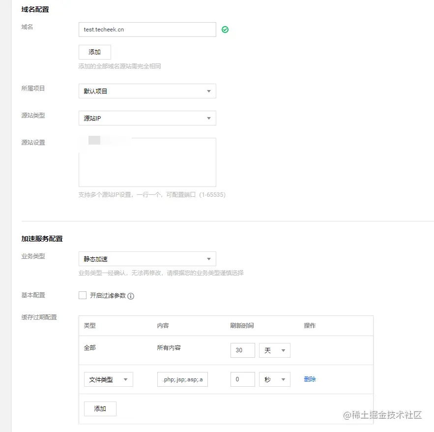 将记录类型修改为CNAME,解析记录修改为刚刚系统分配的test.techeek.cn.cdn.dnsv1.com
