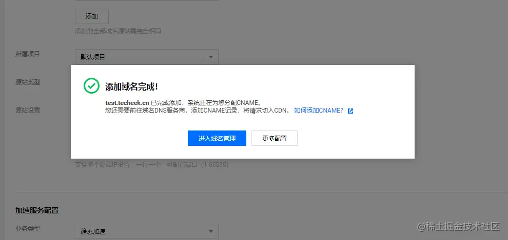 复制系统分配的CNAME域名test.techeek.cn.cdn.dnsv1.com。