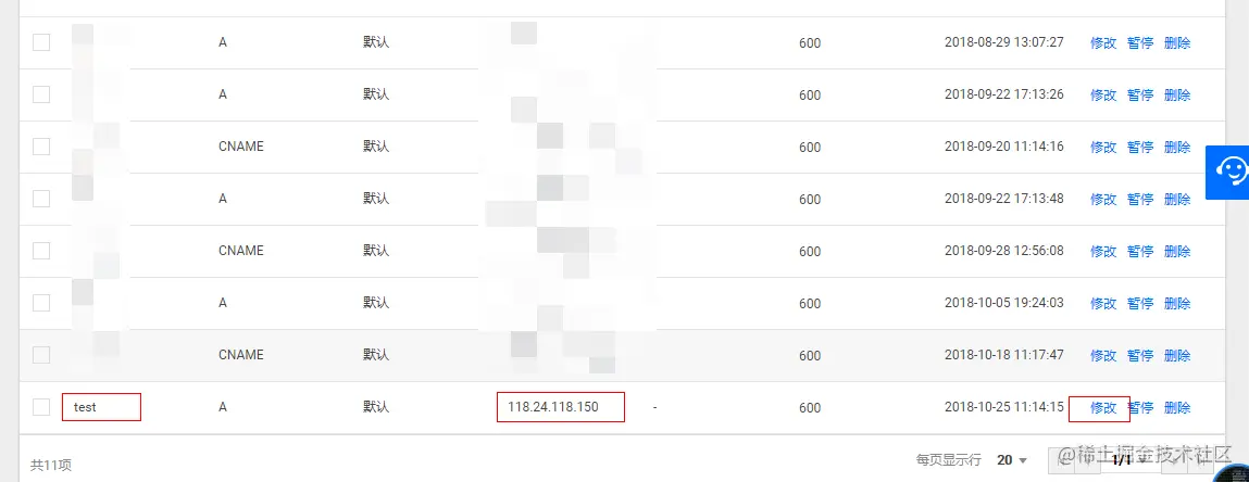 接下来添加或修改当前域名的解析地址。我们找到当前域名的主机记录然后点击修改按钮。
