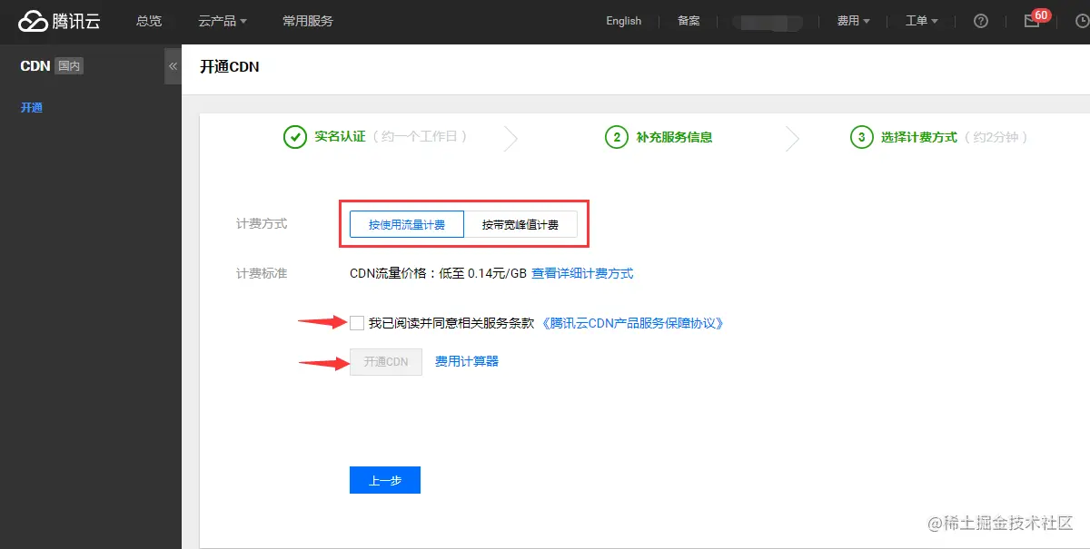 CDN 提供了两种计费方式:流量计费、带宽计费,您可以根据业务模型选择合适的计费方式,更多详细说明请参见 计费说明。勾选同意服务条款后,单击【开通 CDN】即可开始使用加速服务。