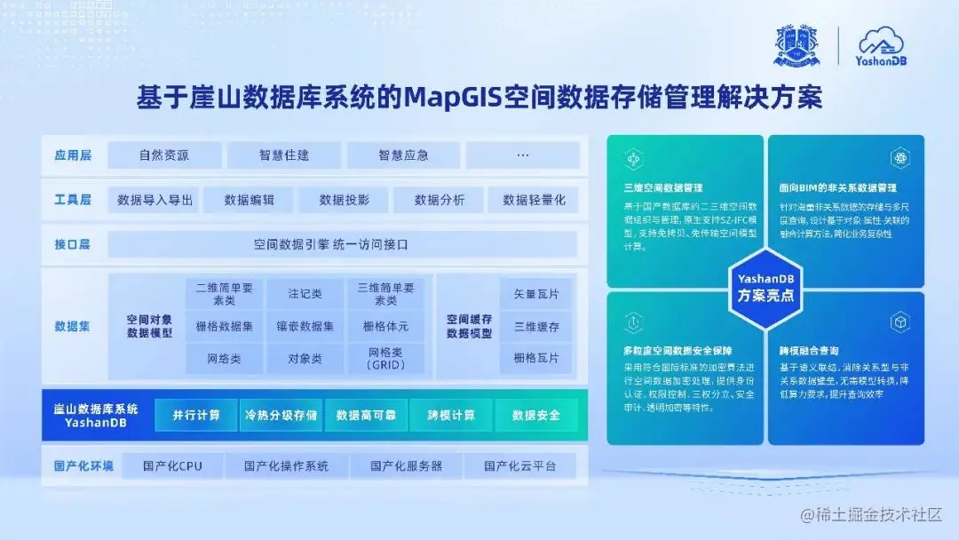 此次发布的解决方案以国产数据库系统YashanDB为底座、MapGIS为支撑,内核代码自主率100%,全面适配国产化环境,具备丰富强大的GIS能力,包括三维空间数据存储管理、SZ-IFC数据无损导入、三维空间数据检索、空间数据加密等,为数字孪生、自然资源、智慧住建、智慧应急等多个领域提供技术领先、自主可控、性能稳定的完整解决方案。