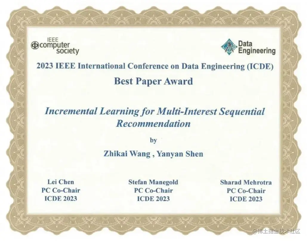 5月18日消息,近日,数据库领域三大顶会之一的ICDE 2023(IEEE International Conference on Data Engineering,CCF-A类会议)在美国召开,上海交通大学电子信息与电气工程学院计算机系数据驱动软件技术实验室成员凭借多兴趣序列推荐的增量学习研究获得了ICDE 2023唯一的最佳论文奖。