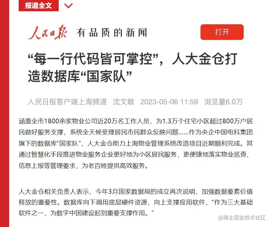5月6日,人大金仓《“每一行代码皆可掌控”,人大金仓打造数据库“国家队”》一文被人民日报报道。
