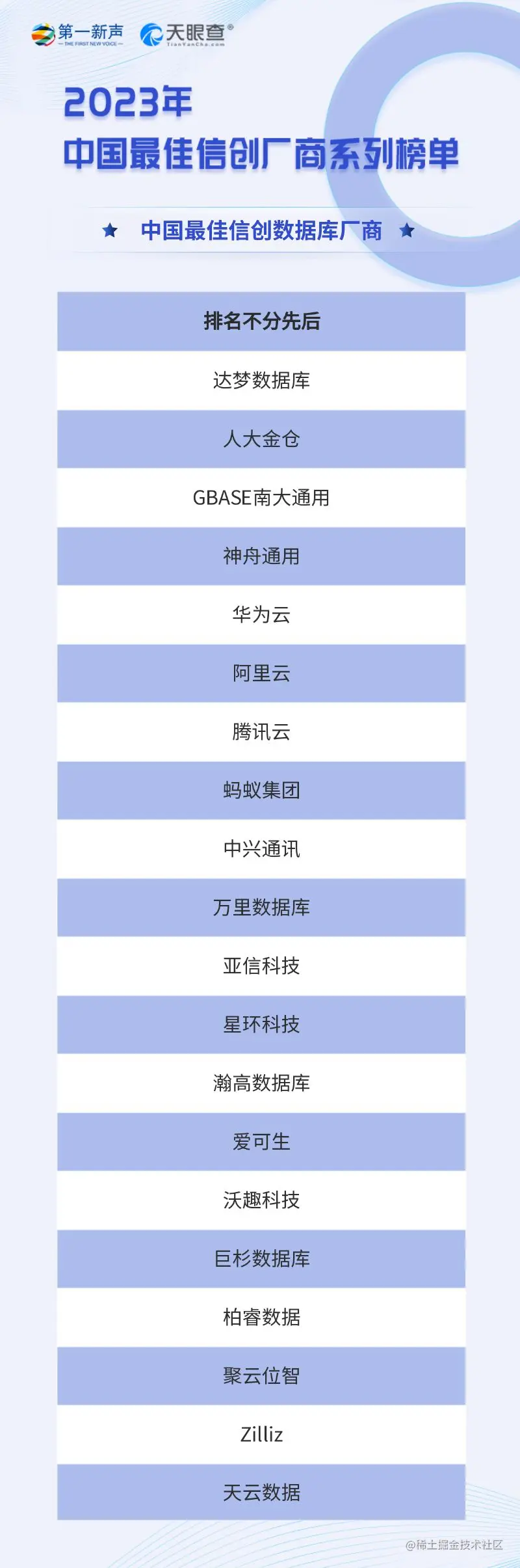 5月29日,由第一新声联合天眼查发起的2023年中国最佳信创厂商系列榜单正式发布,20家国产数据库厂商入选“2023年中国最佳数据库厂商名单”。