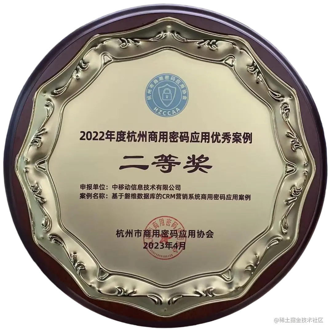 5月8日,2023西湖论剑·数字安全大会商用密码应用论坛上发布“2022年度杭州商用密码应用优秀案例”,其中由中国移动通信集团浙江有限公司和中移动信息技术有限公司联合申报的《基于磐维数据库的CRM营销系统商用密码应用案例》荣获二等奖。