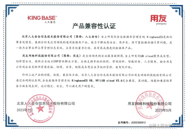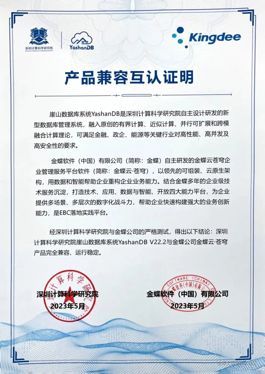 5月,AntDB数据库完成与金蝶Apusic应用服务器、绿算技术 ForinnBase GroundPool系列全闪存储设备、威派格智慧水务威爱平台V4的兼容认证。