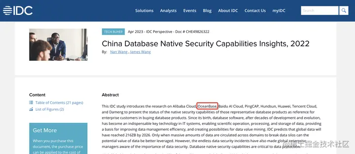 5月10日消息,近日,国际权威市场研究机构 IDC 正式发布《中国数据库原生安全能力洞察 2022》研究报告,OceanBase凭借领先的数据一致性、数据访问控制、数据加密、高可用等数据库原生安全能力,作为中国数据库的代表厂商入选此报告。入选该报告,意味着 OceanBase 原生安全能力的卓越表现得到了国际权威机构的认可。