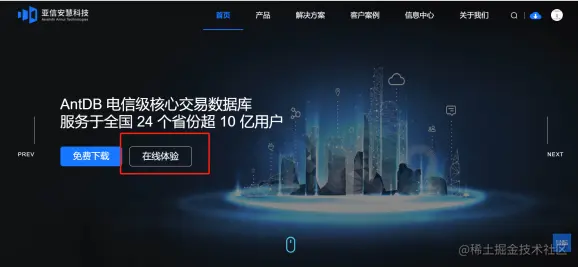 打开AntDB数据库官网,点击首页banner“在线体验”或者直接点击“信息中心”即可进入实验室页面,开启体验之旅。