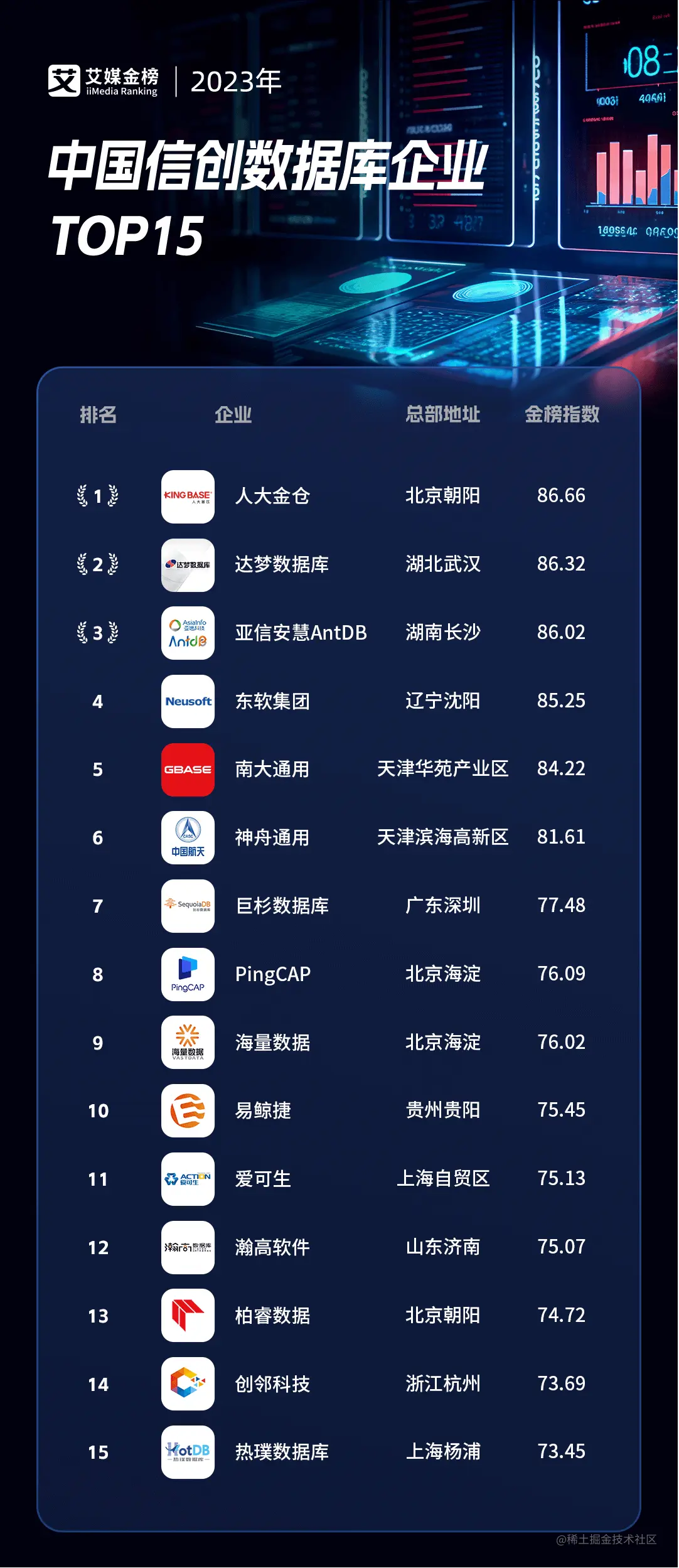 5月24日,艾瑞咨询发布了“2023年中国信创数据库企业TOP15”,人大金仓、达梦数据库、亚信安慧AntDB分别位列前三名。