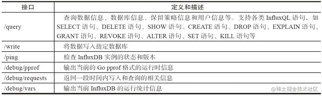influxDB API接口及接口的定义描述如下图所示: