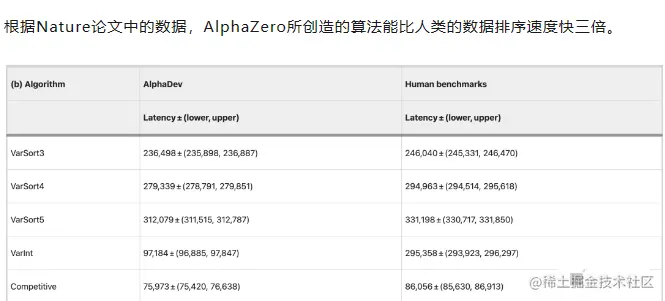然而,AlphaDev打破了这个常识。它在给定一个要排序的数据集和一个时间限制(即1秒)的情况下,生成了一个新的排序算法,并且将其命名为AlphaSort。AlphaSort在时间复杂度上仍然保持了O(nlogn)的水平,但在空间复杂度上却做到了O(1),也就是说,它不需要任何额外空间来完成排序。这一点超越了所有已知的经典排序算法。此外,AlphaSort在实际运行时还表现出了惊人的速度优势。根据DeepMind在Nature上发表的论文¹²,AlphaSort能够将一个包含1000万个随机整数(范围从0到2^32-1)的数组在平均0.14秒内完成排序,而目前C++中使用的最快的经典排序算法std::sort则需要平均0.46秒。这意味着AlphaSort将排序速度提高了70%。