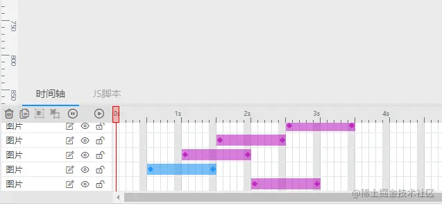 首先,在H5DS编辑器的底部有一个动画时间轴,可以用于编辑动画的状态。每一行代表一个图层,每条色带代表动画效果,紫色代表进入动画,蓝色代表强调动画,黄色代表离开动画。可以拖动色带设置动画的延迟时间,也可以拖动色带两端的小点设置动画执行的时长。动画时间轴可以帮助我们在制作H5界面时更好的控制素材单个动画效果。