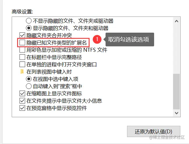 - 取消勾选 【隐藏已知文件类型的扩展名】 选项。