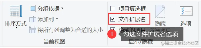 - 在 【查看】选项卡的 【显示/隐藏】 组中,勾选 【文件名扩展名】 选项;