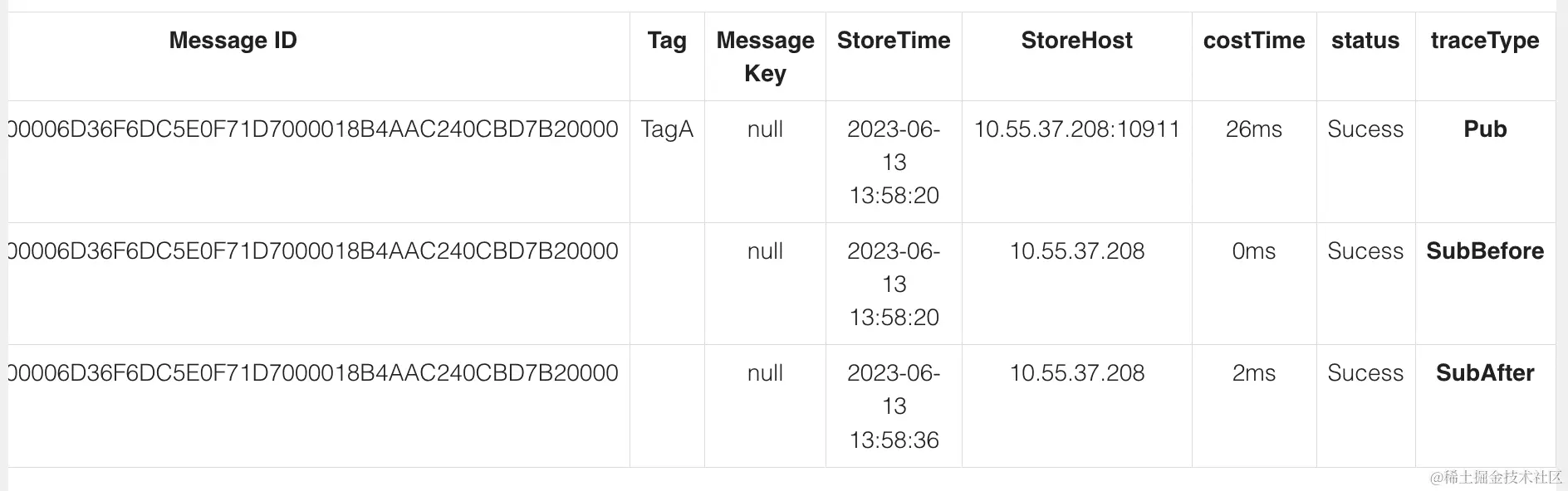 图片来自rocketmq-dashboard,早期叫rocketmq-console-ng,和阿里云收费版控制台差不多,根据MessageID或MessageKey查询消息生产消费链路。