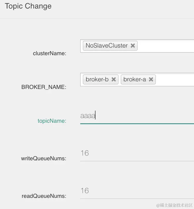 比如下面创建topic=aaaa,broker-a和broker-b分别创建了16个物理队列,topic下总共有32个物理队列。