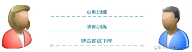 假设Alice和Bob想共同训练一个网络模型,Alice和Bob各自持有一部分训练数据,并且他们不想把自己的数据泄露给对方。那么在训练期间,Alice和Bob需要交互各自训练的梯度数据,并根据双方的梯度数据,共同计算一个对双方都合适的梯度值,用来执行联合梯度下降过程。